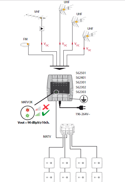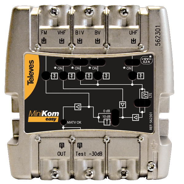 Possui 5 entradas: FM-VHF-UHF-21…36-38….60. A banda UHF está dividida em 2 das entradas, útil em instalações de recepção de dois repetidores, já que permite filtrar os canais que não correspondem a cada um deles. As de VHF e as de UHF possuem os dois margens de ganho seleccionáveis enquanto a entrada de FM tem uma única etapa amplificadora.