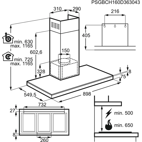 Cap. de extração, nível máx/mín: 350 m3/h / 150 m3/h m³/h