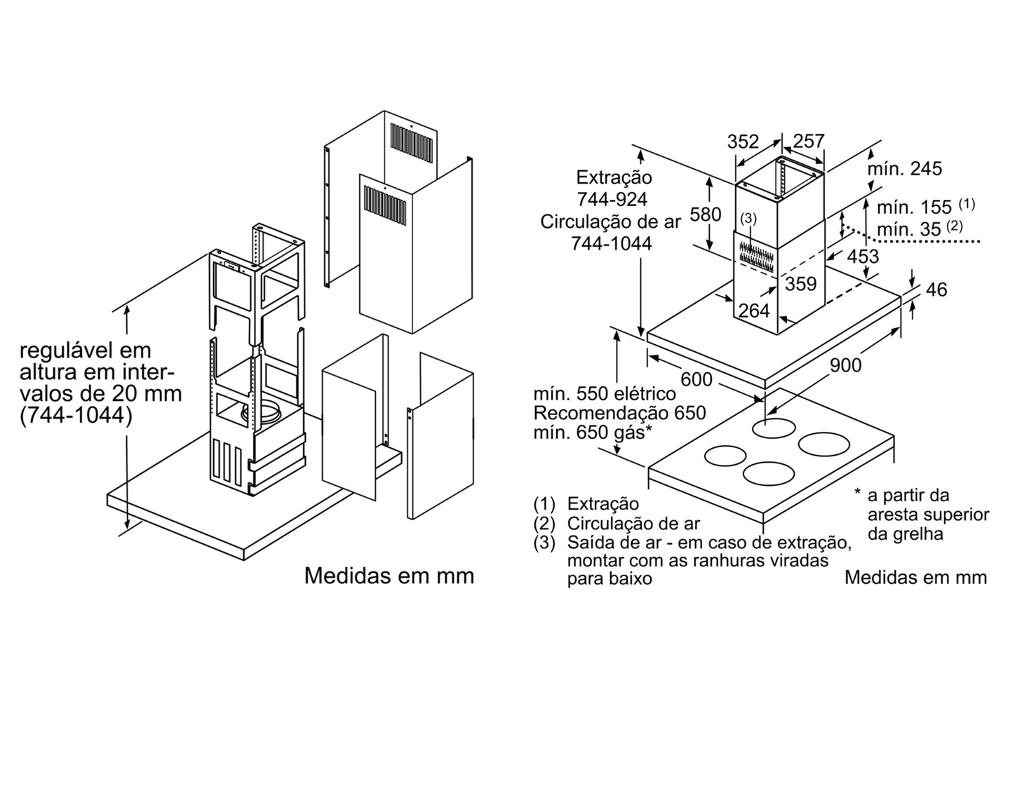 Medidas do aparelho em recirculação de ar (AxLxP): 744-1044 x 898 x 600 mm