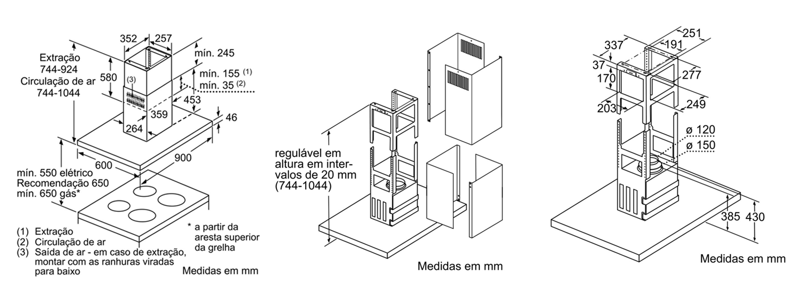 Medidas do aparelho em recirculação de ar (AxLxP): 744-1044 x 898 x 600 mm