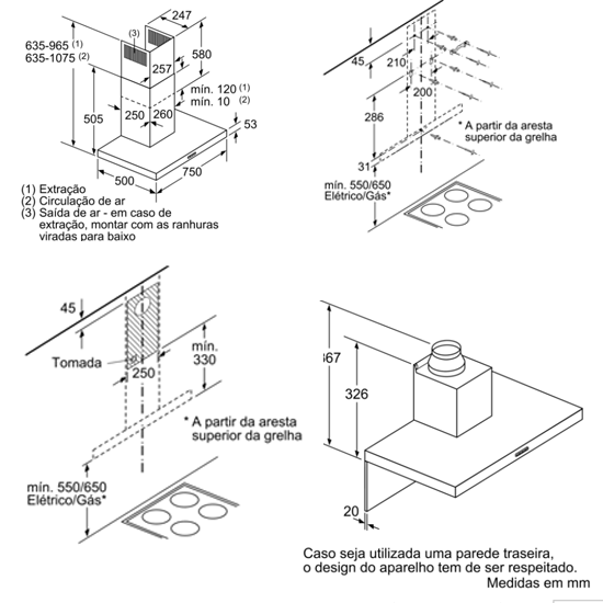 Medidas do aparelho em saída de ar (AxLxP): 635-965 x 750 x 500 mm