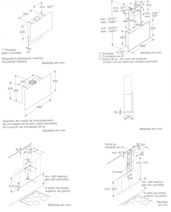 Medidas do aparelho em recirculação de ar sem chaminé (AxLxP): 550 mm x 890 x 263 mm