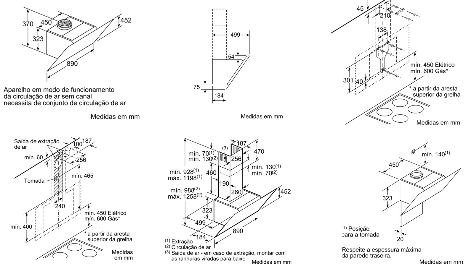 Medidas do aparelho em recirculação de ar sem chaminé (AxLxP): 452 mm x 890 x 499 mm