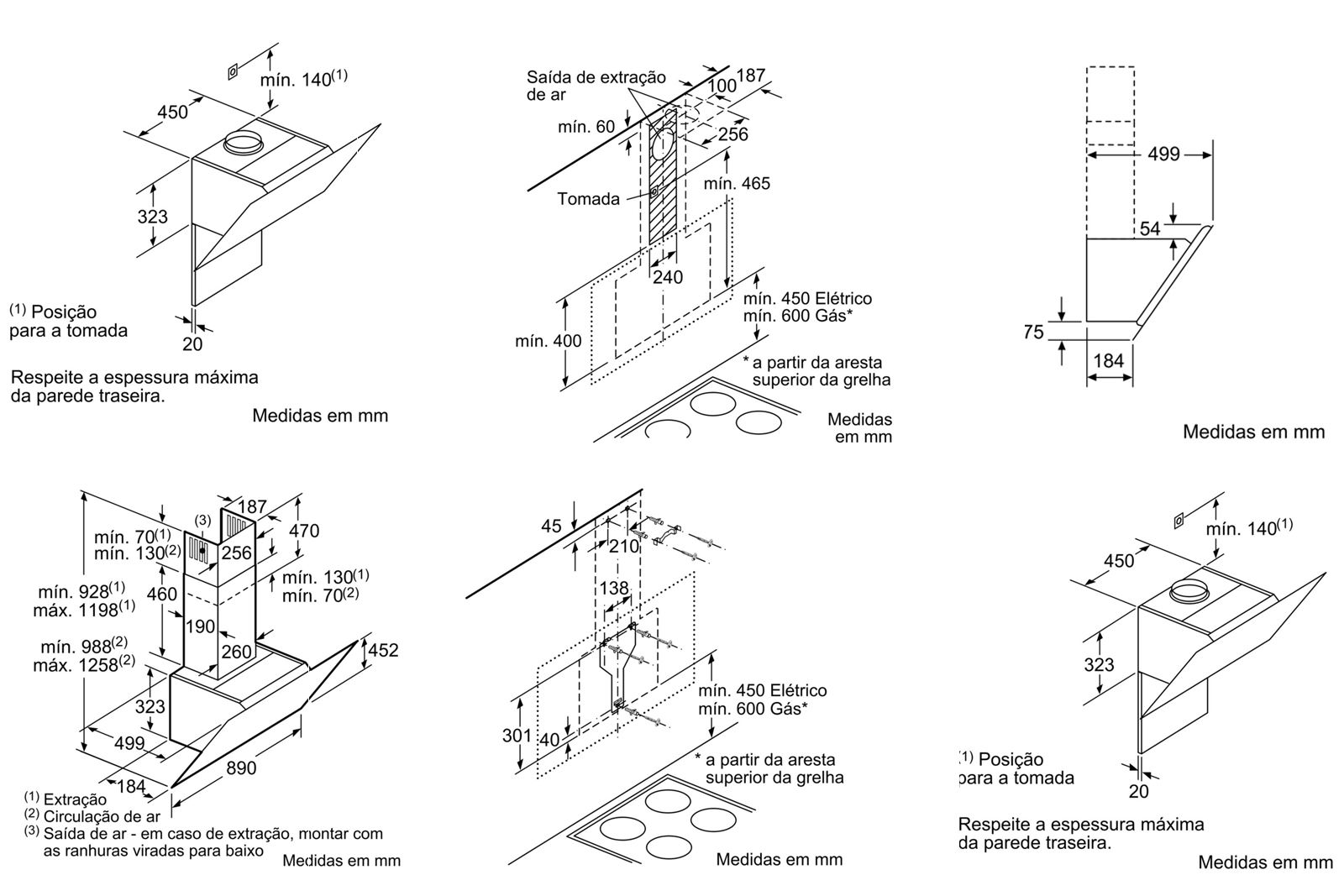 Medidas do aparelho em recirculação de ar sem chaminé (AxLxP): 452 mm x 890 x 499 mm
