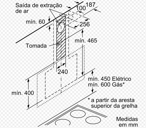 Medidas do aparelho em recirculação de ar sem chaminé (AxLxP): 480 mm x 894 x 548 mm