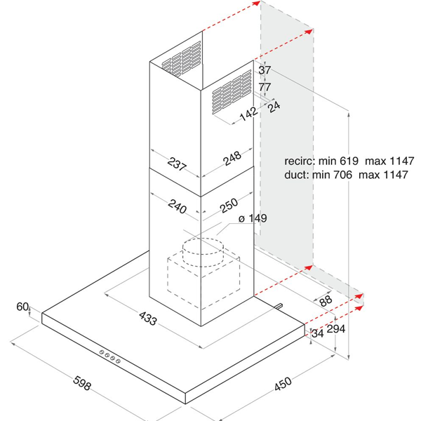 CLASSE C – LARGURA: 60CM – CAP. MÁXIMA EXTRAÇÃO: 581M3/H – 68dB(A) – INOX