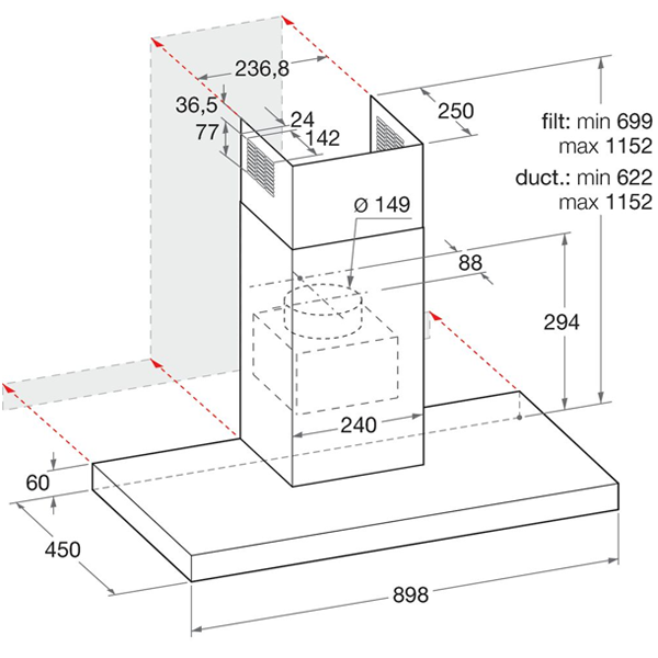 CLASSE C – LARGURA 90CM – CAP. MÁXIMA EXTRAÇÃO: 581M3/H – 68dB(A) – INOX