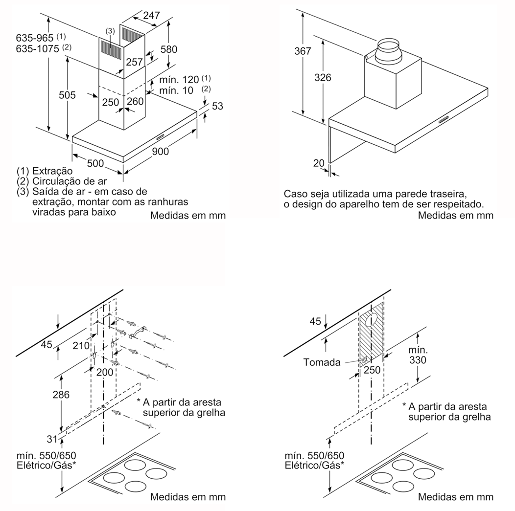 Medidas do aparelho em saída de ar (AxLxP): 635-965 x 900 x 500 mm