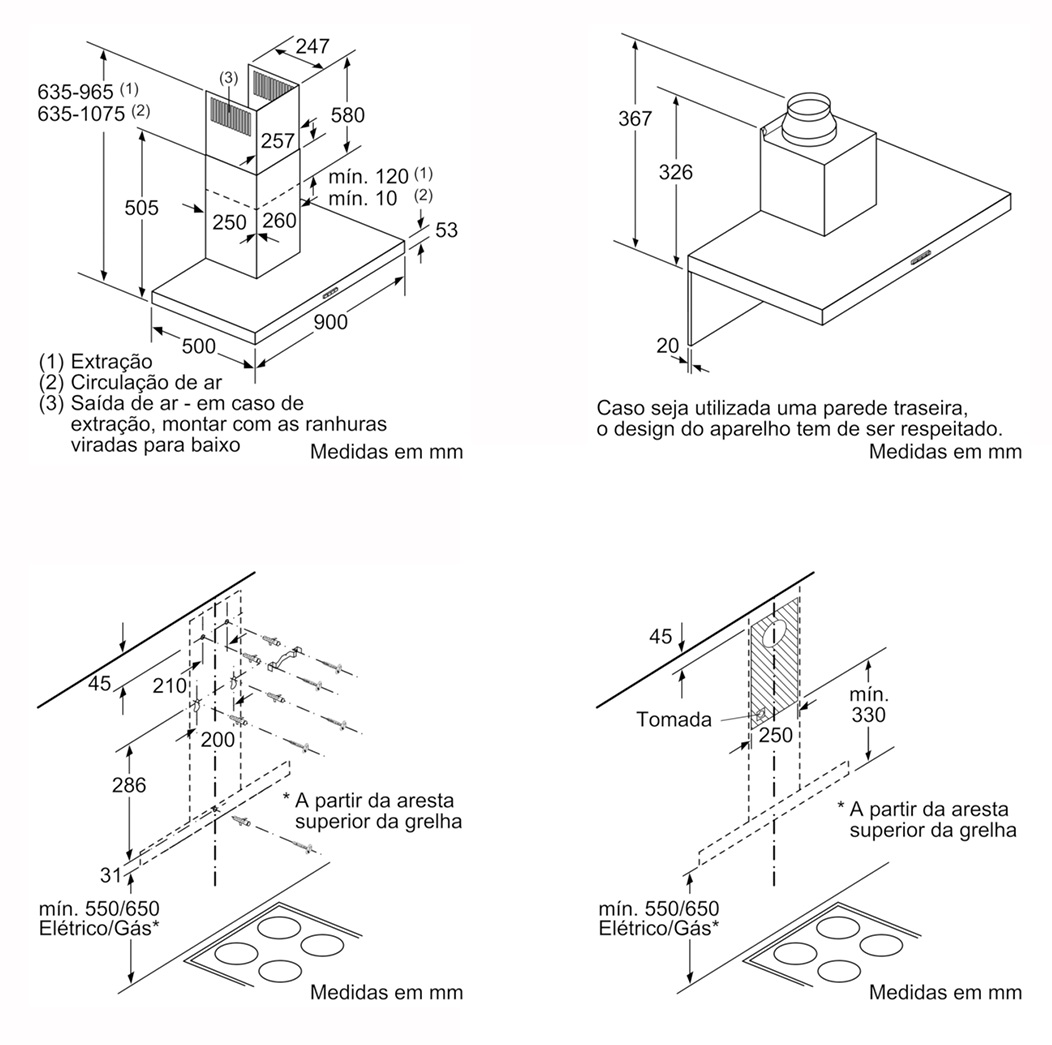 Medidas do aparelho em saída de ar (AxLxP): 635-965 x 900 x 500 mm