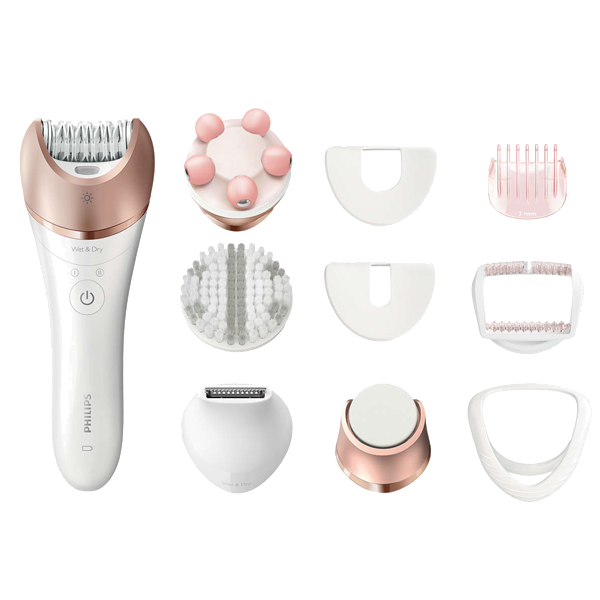 Acessórios: Lima eléctrica para pés, Massajador corporal, Escova de esfoliação corporal, Pente aparador da linha do biquíni, Cabeça aparadora para linha do biquíni, Acessório para rosto, Acessório para zonas delicadas, Acessório de massagem, Acess. p/ esticar pele, Bolsa, Escova de limpeza.