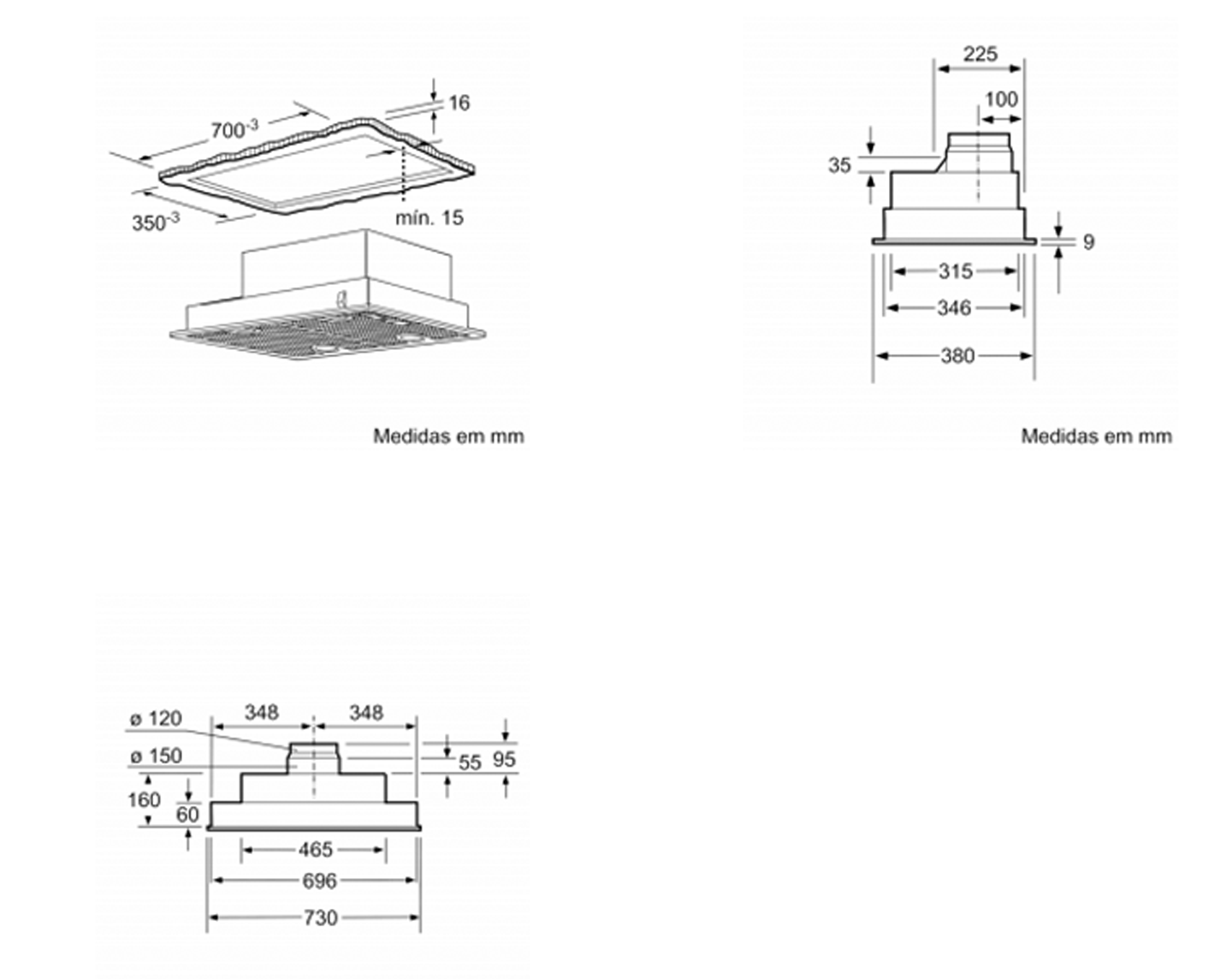 Medidas do aparelho em recirculação de ar (AxLxP): 255-255 x 730 x 380 mm
