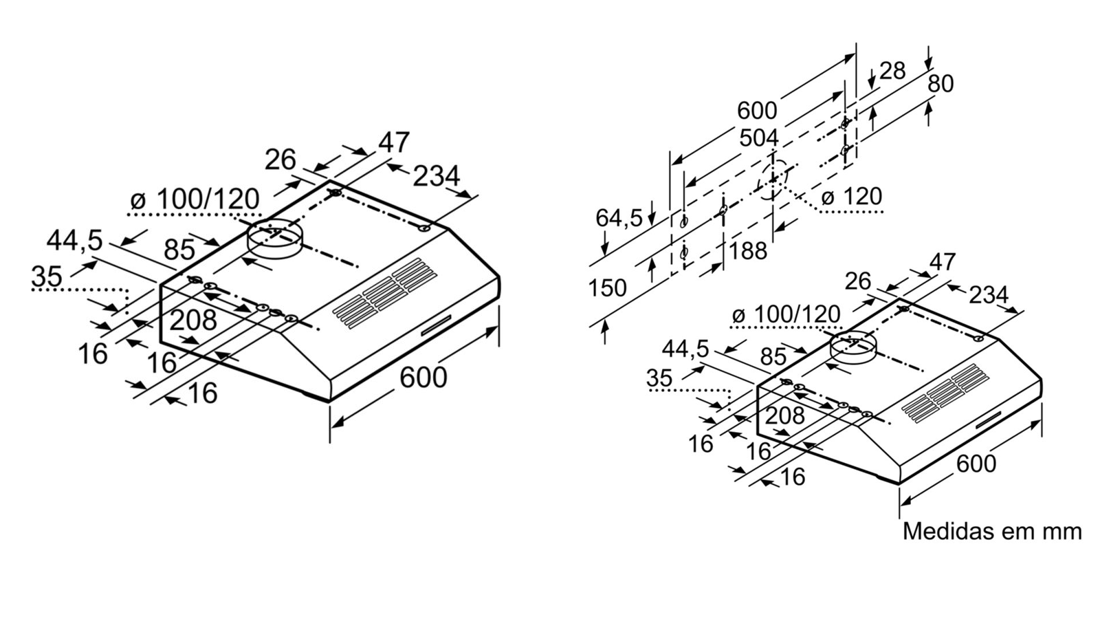Diâmetro das condutas Ø 120 mm ou Ø 100 mm