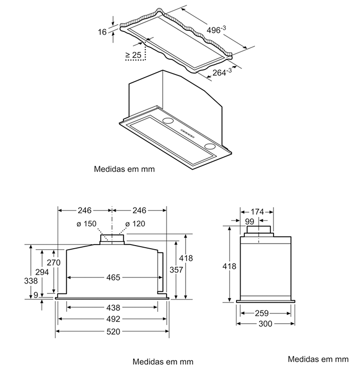 Medidas do aparelho em saída de ar (AxLxP): 418-418 x 520 x 300 mm