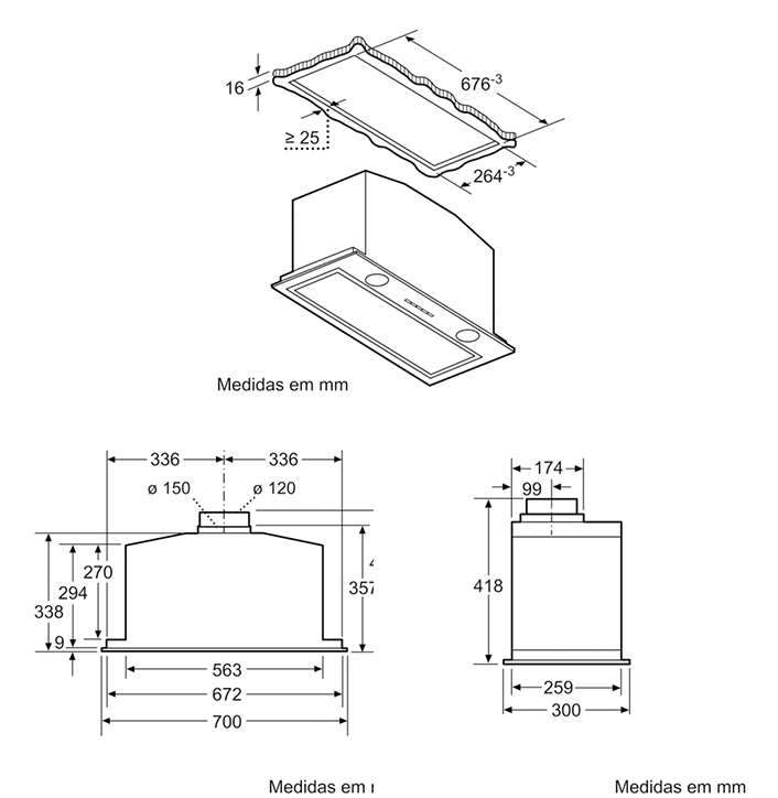 Diâmetro das condutas Ø 150 mm ou Ø 120 mm