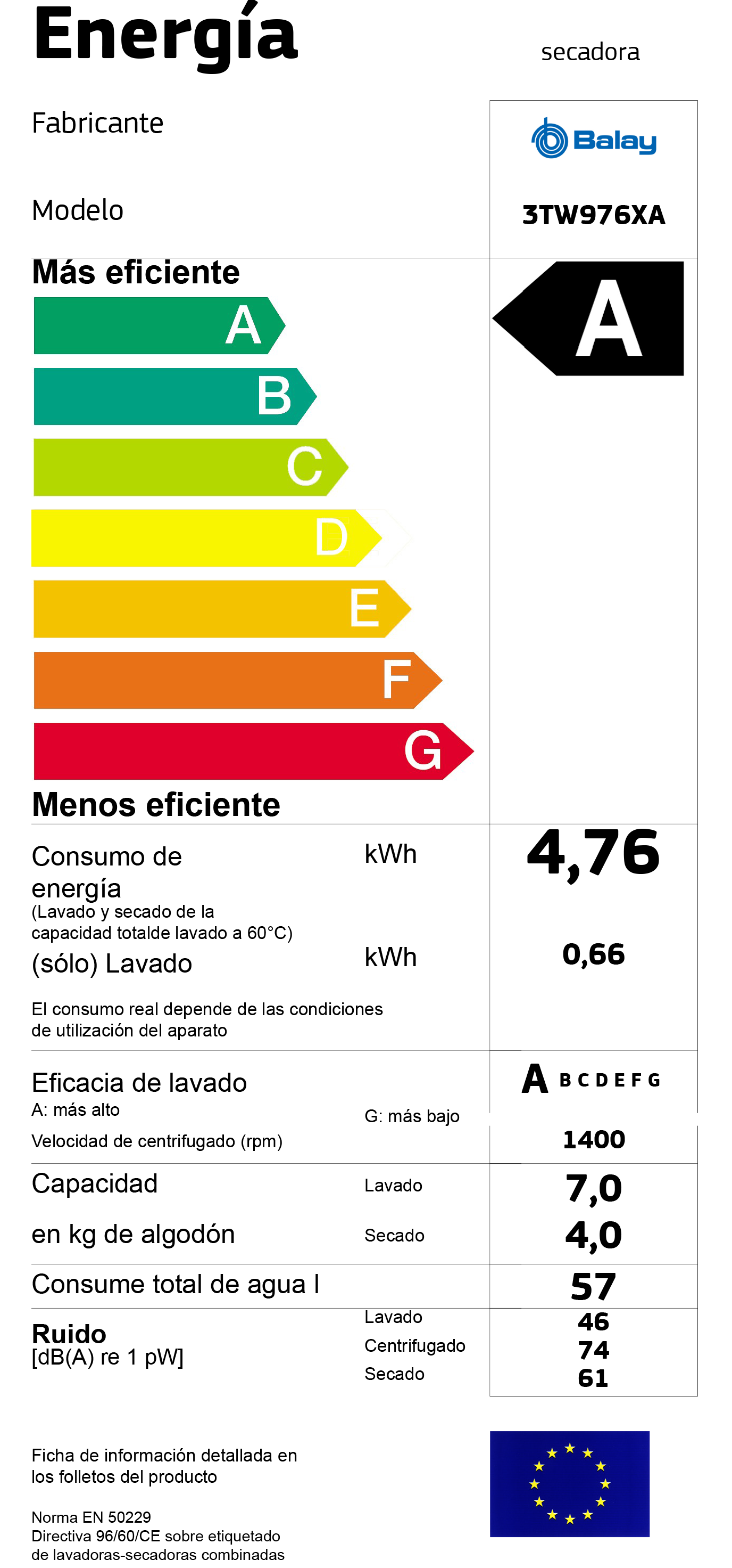 Consumos lavagem + secagem: – Água: 57 llitros – 4.76 kWh – 585 min