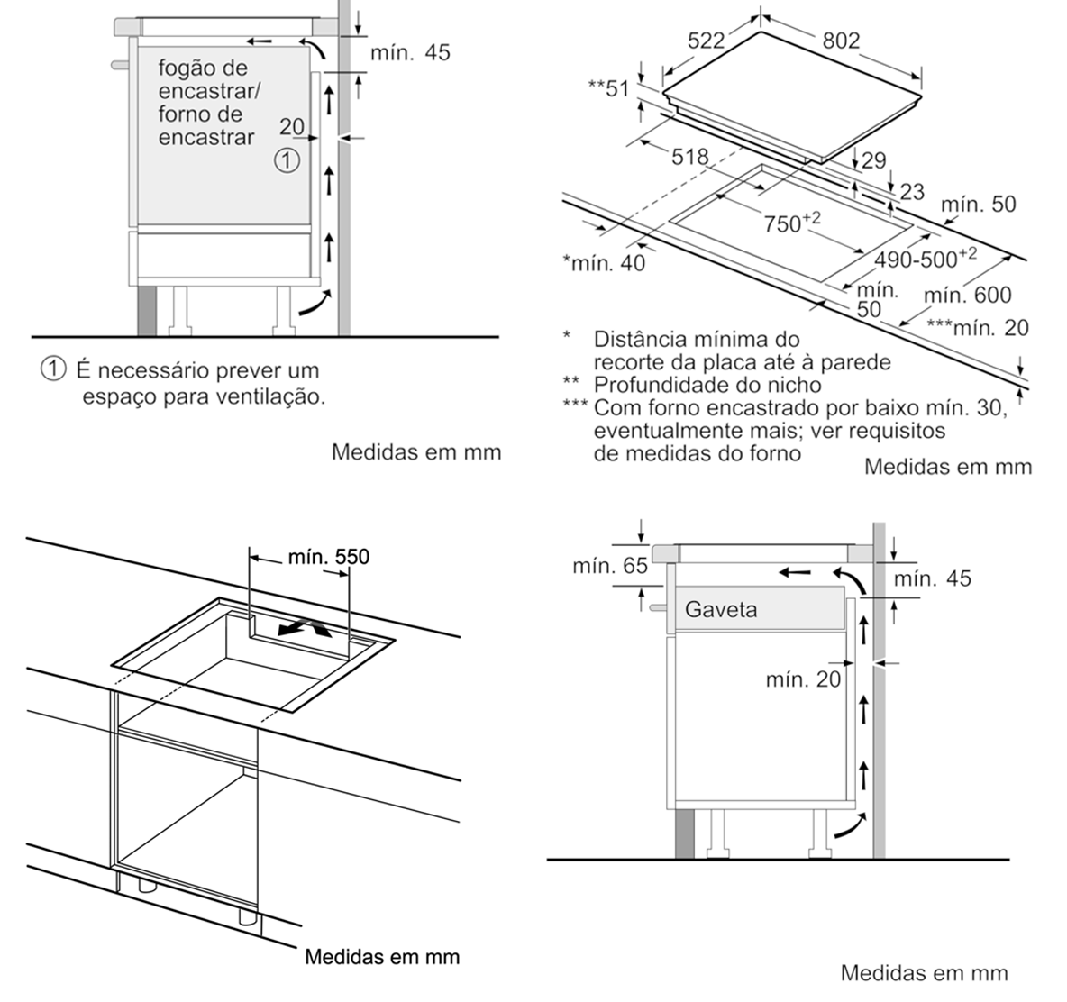 Espessura minima da bancada: 30 mm