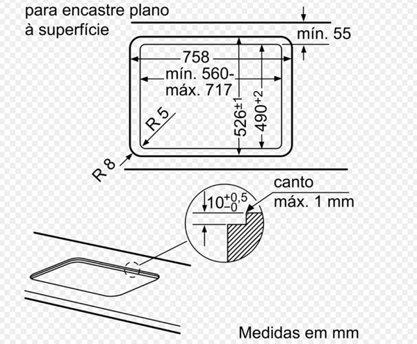 Espessura mínima da bancada: 30 mm