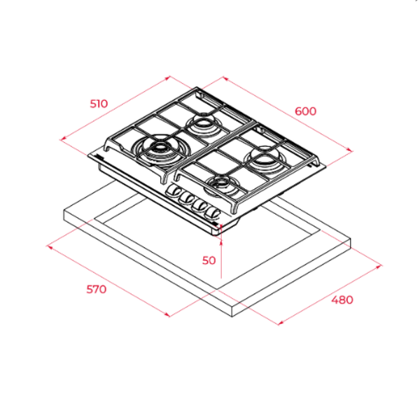 4 QUEIMADORES A GÁS – LARGURA 60CM – 9,55kW – CASTANHO – GÁS NAT