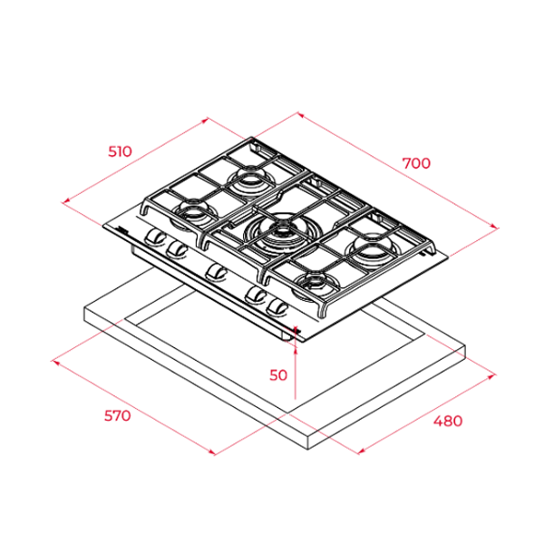 5 QUEIMADORES A GÁS – LARGURA: 70CM – 9.2kW – PRETO – FRENTE BISELADA – GÁS NAT