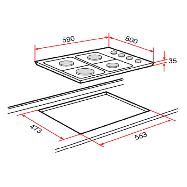 Dimensões de encastre no móvel (LxAxP): 553x35x473mm