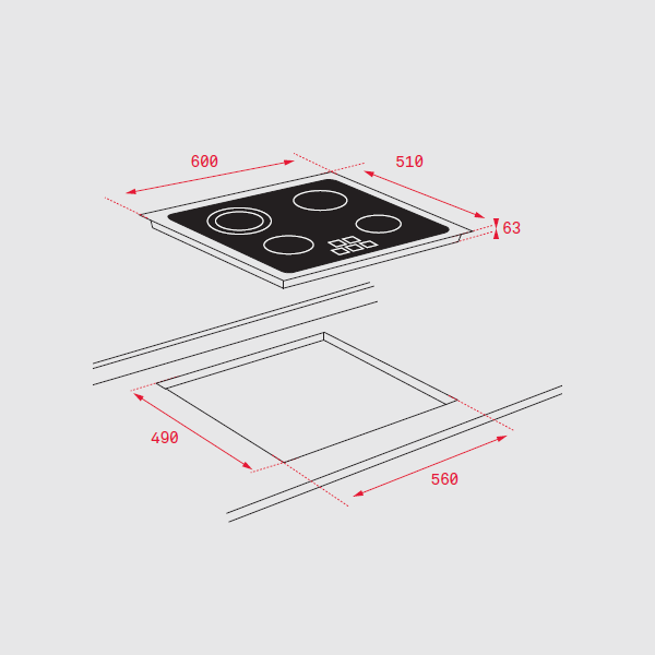 4 ZONAS VITROCERÂMICAS – LARGURA 60CM – 6,2kW – VIDRO PRETO – BISELADO FRONTAL