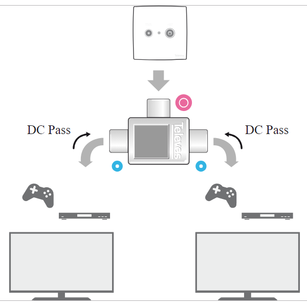 Repartidor inductivo de 2 direcções e conectores CEI, para sinais de TV. Possui um conector fêmea e os outros macho.