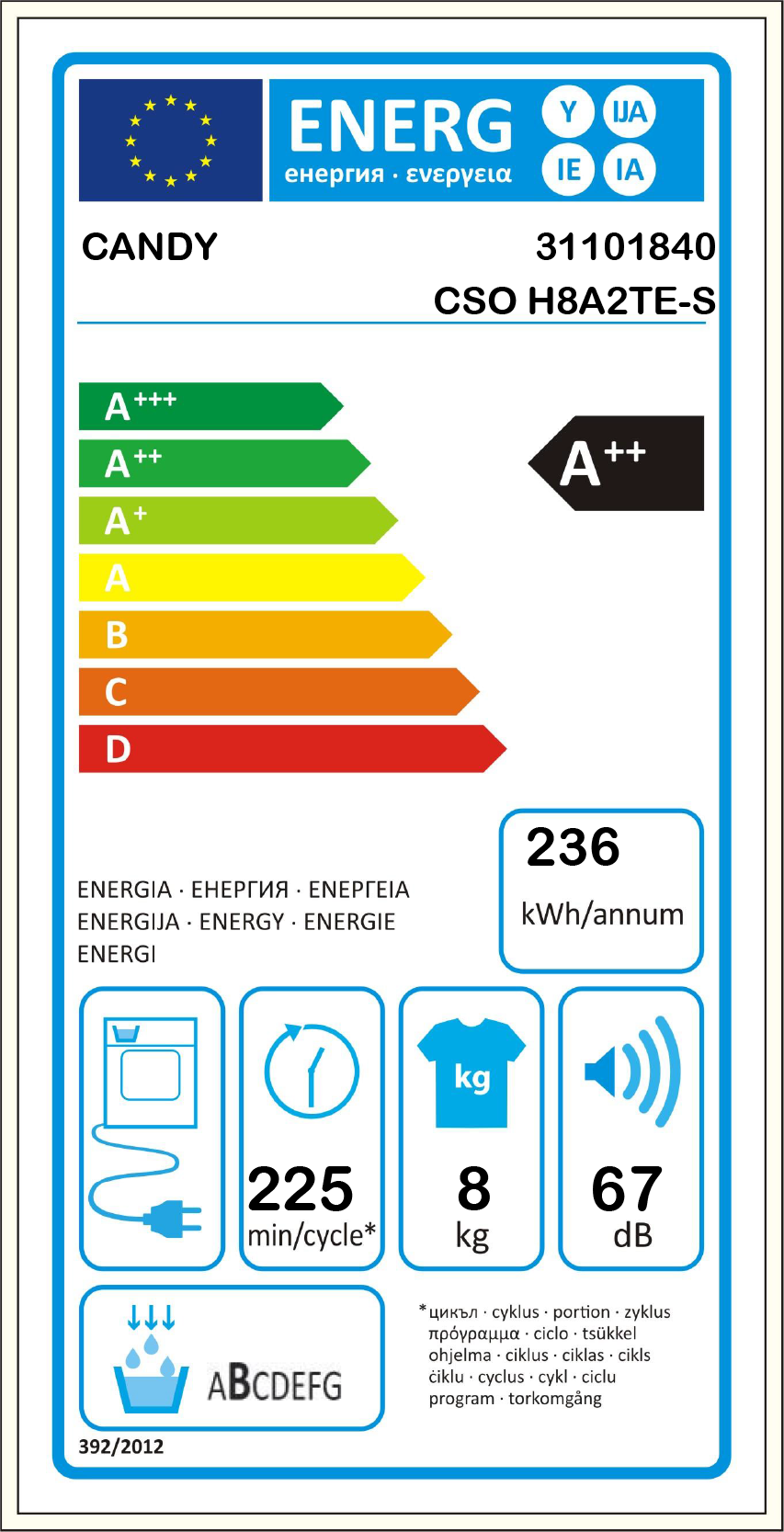 Consumo de energia ciclo (secagem completa/secagem parcial): 236 kWh / 1,94 kWh