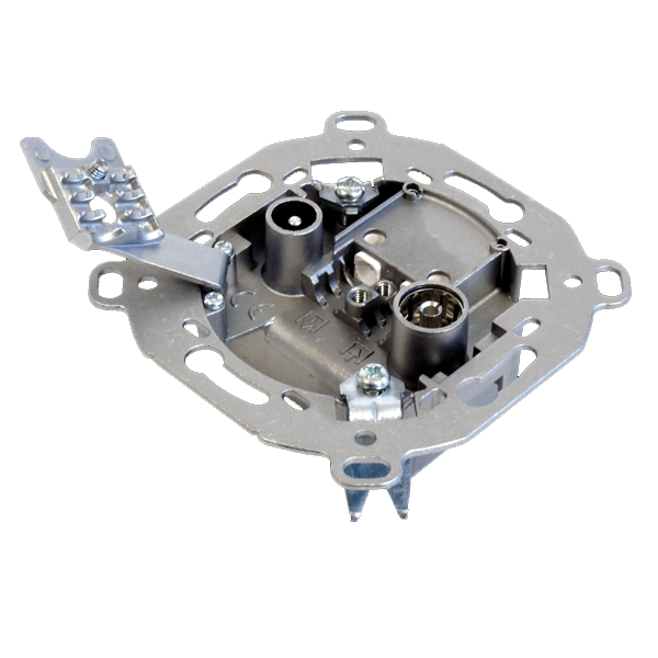 Tomada terminal separadora com dois conectores CEI. O da esquerda é um CEI macho para FM (radio) e TV terrestre e o da direita é um CEI fêmea para TV satélite (FI).